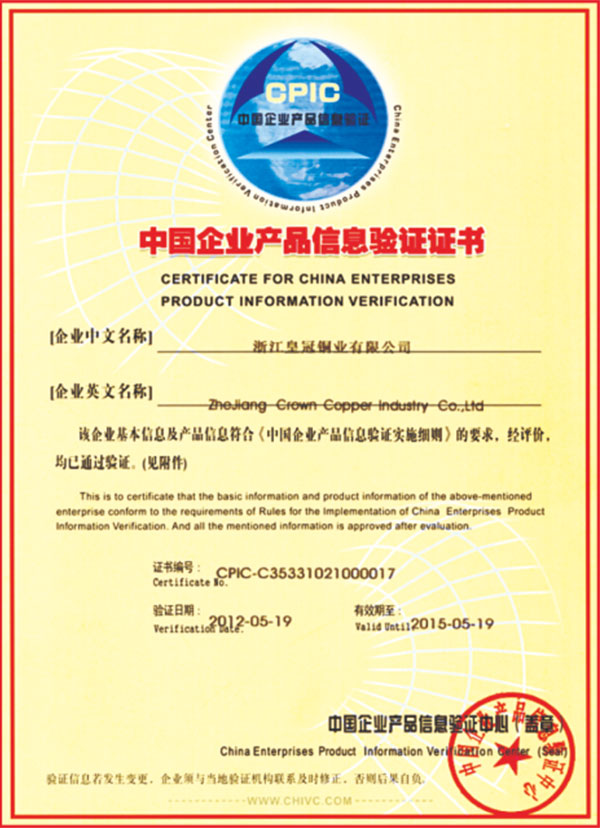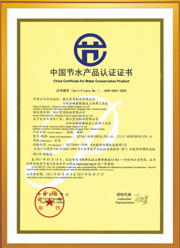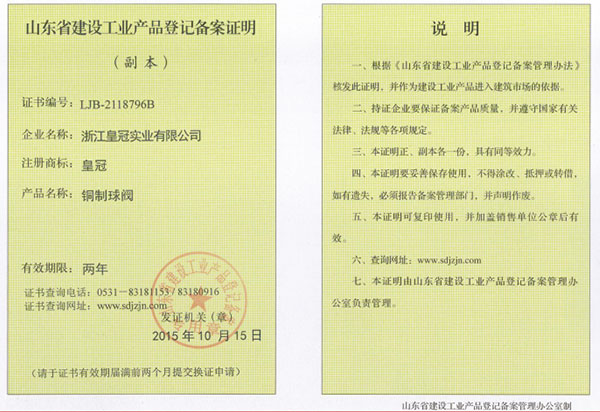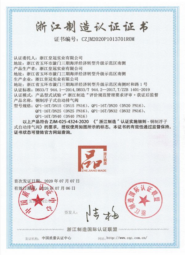 "皇冠"是浙江皇冠實業(yè)有限公司的注冊商標,"皇冠"銅閥門是《閥門用銅合金鍛件技術(shù)條件》國家標準起草單位,是《銅制浮子式自動排氣閥》行業(yè)標準起草單位,是《銅制浮子式自動排氣閥》品字標浙江制造標準起草單位, 是浙江省水暖衛(wèi)浴標準化專業(yè)技術(shù)委員會成員單位,是"守合同重信用"AAA級單位,是銀行信貸信用AAA級單位,擁有銅制浮子式自動排氣閥品字標浙江制造產(chǎn)品認證,已通過ISO 9001質(zhì)量管理體系認證、ISO 14001環(huán)境管理體系認證、OHSAS 18001職業(yè)健康安全管理體系認證、ISO 10012測量管理體系認證,產(chǎn)品由PICC中國人民保險承保, "皇冠"牌系列產(chǎn)品通過在大型建設(shè)工程中廣泛運用,取得了良好的社會效益,樹立了良好的企業(yè)形象,品牌在國內(nèi)擁有較高的知名度。